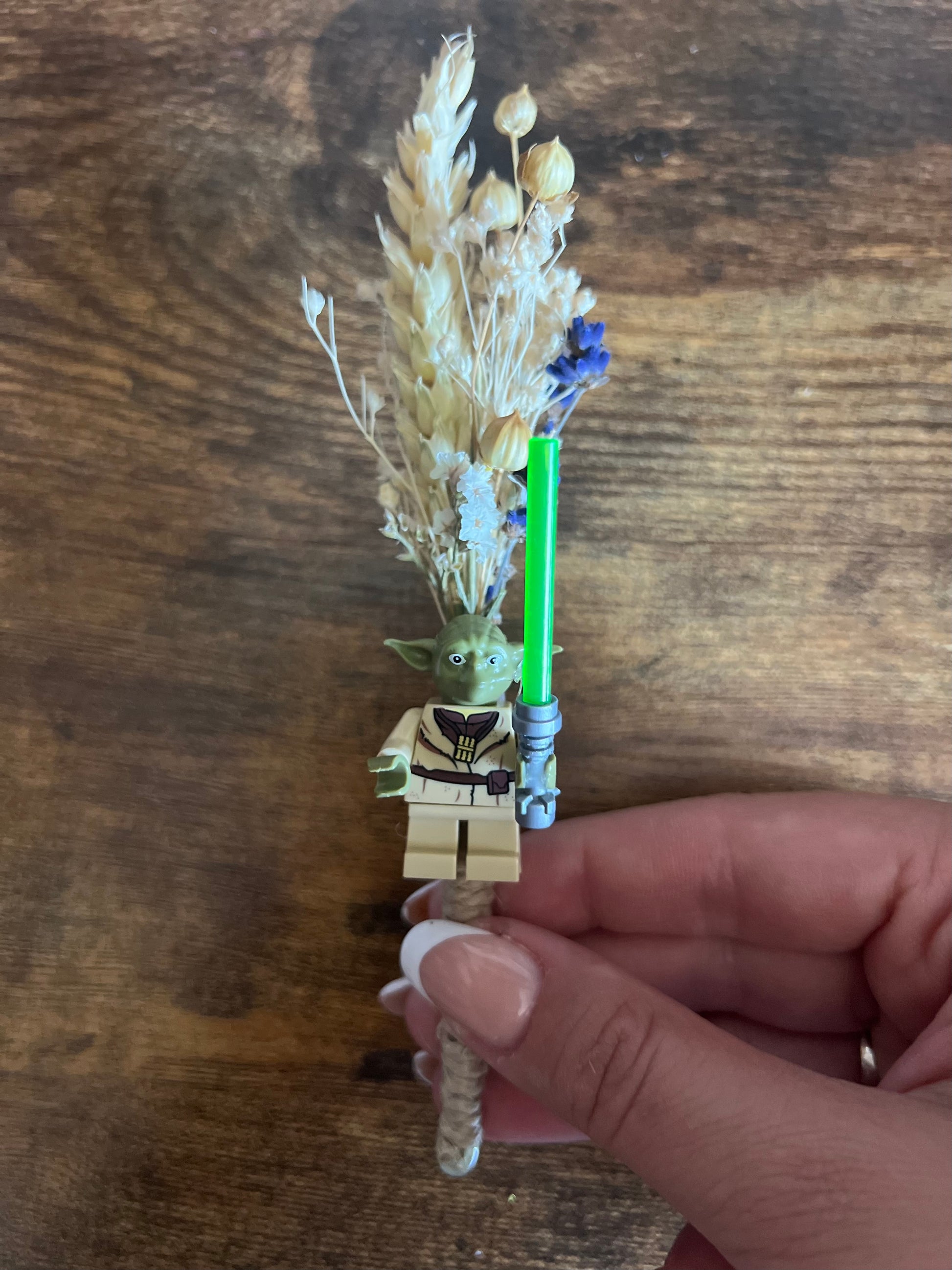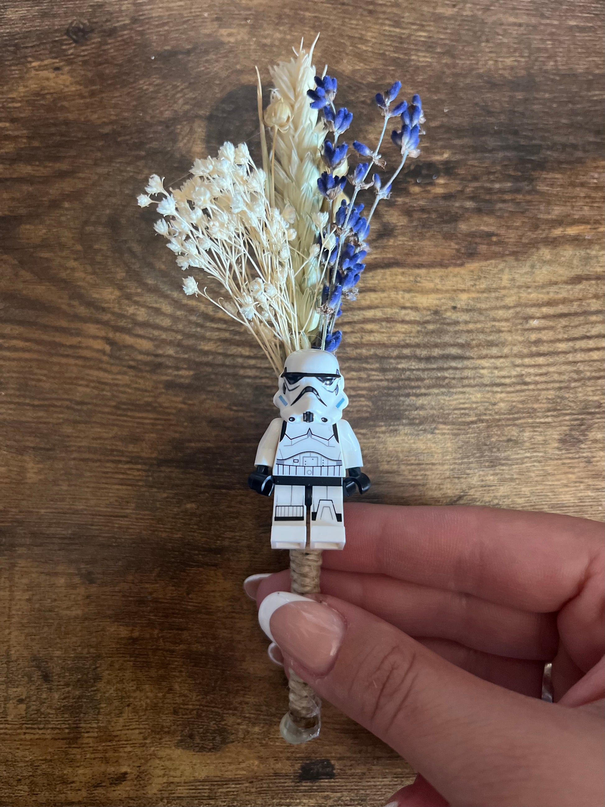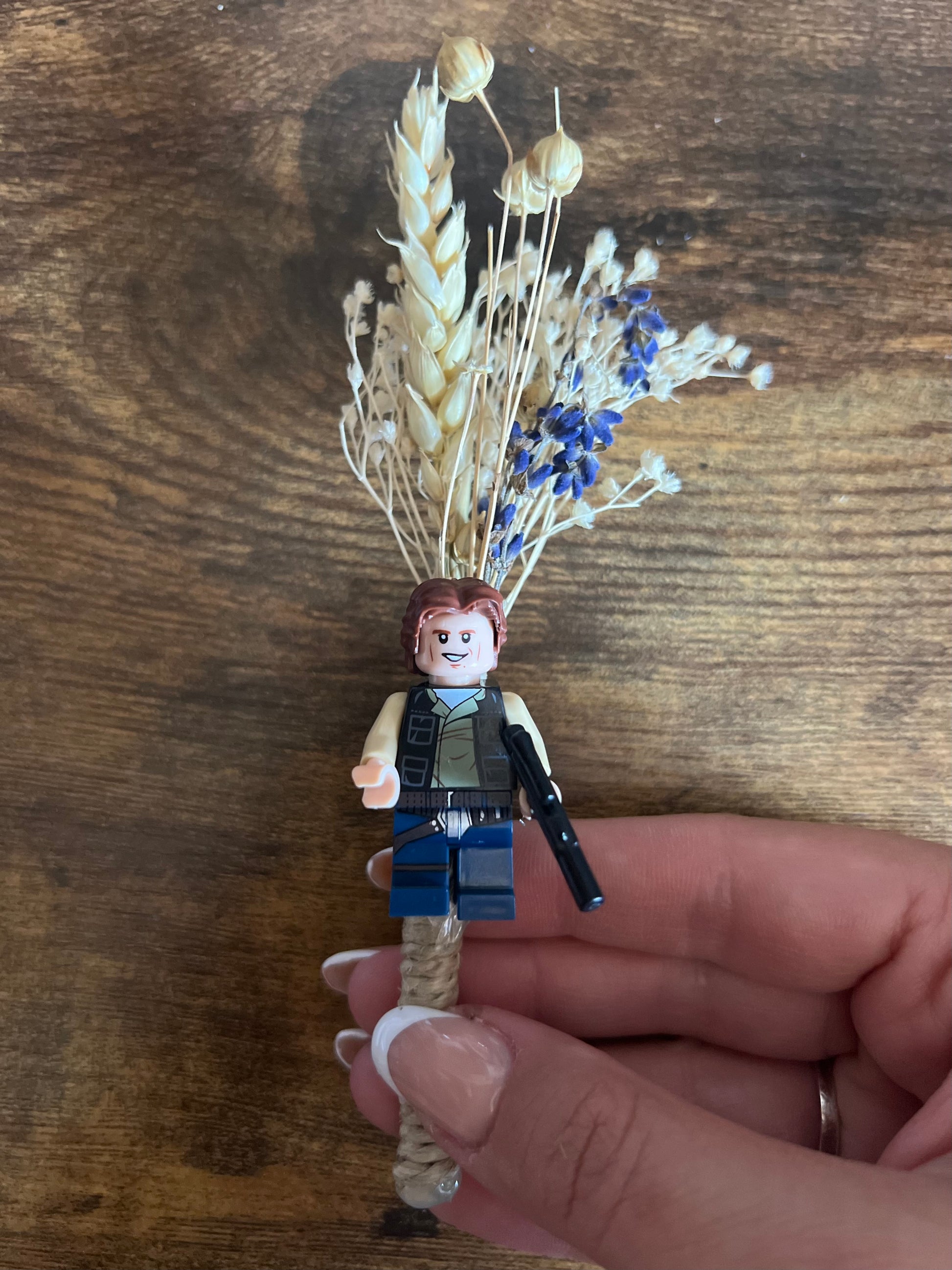 Alfileres de boda para el novio, padrino y las personas más importantes de la celebración. Se hacen por encargo de forma totalmente artesanal, con el personaje que quieras (consultar) y con flores secas.