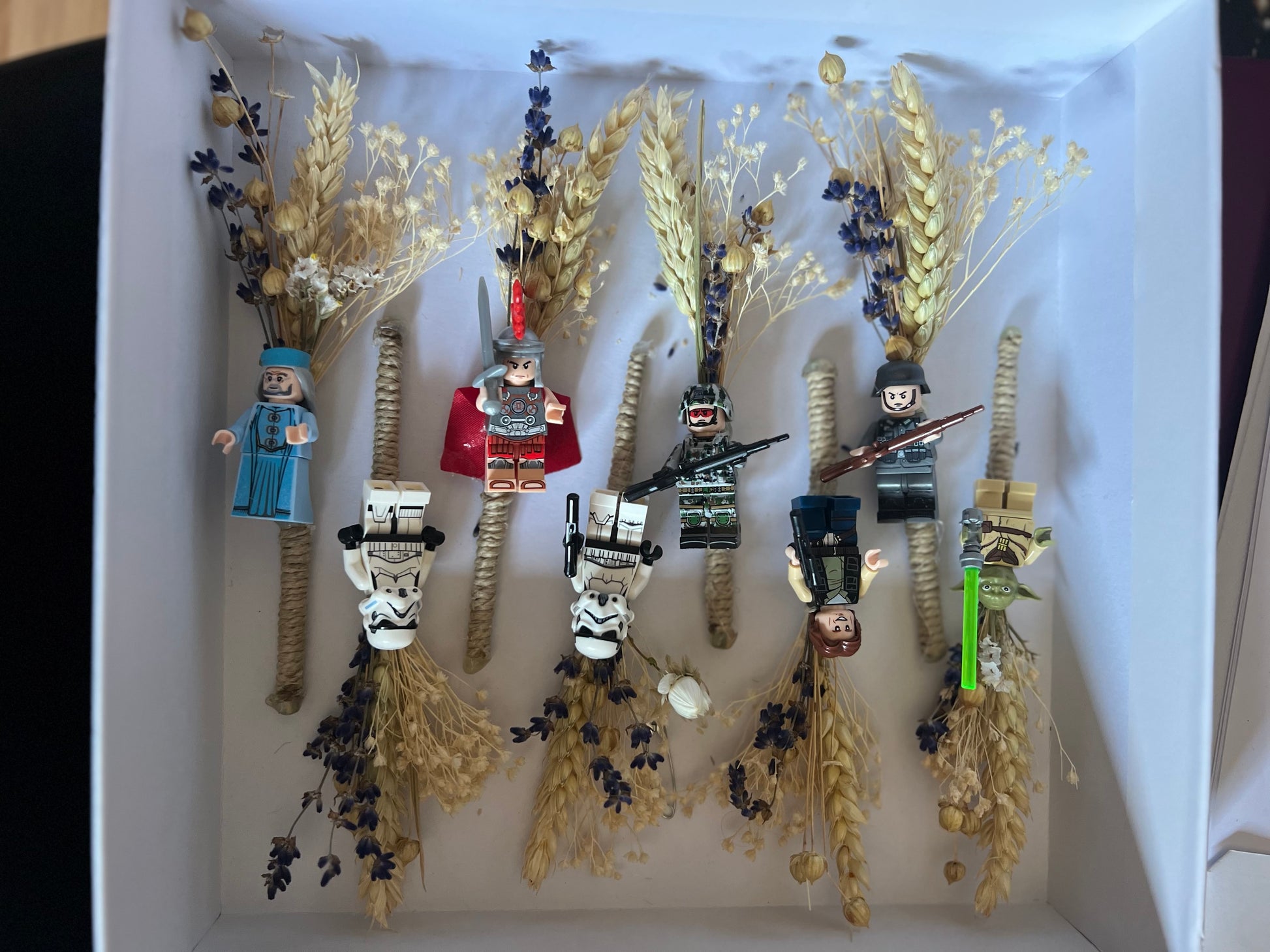 Las muestras que tenemos son con figuritas de bloques de construcción, pero también los estamos empezando a hacer con otro tipo de muñecos y/o figuras.