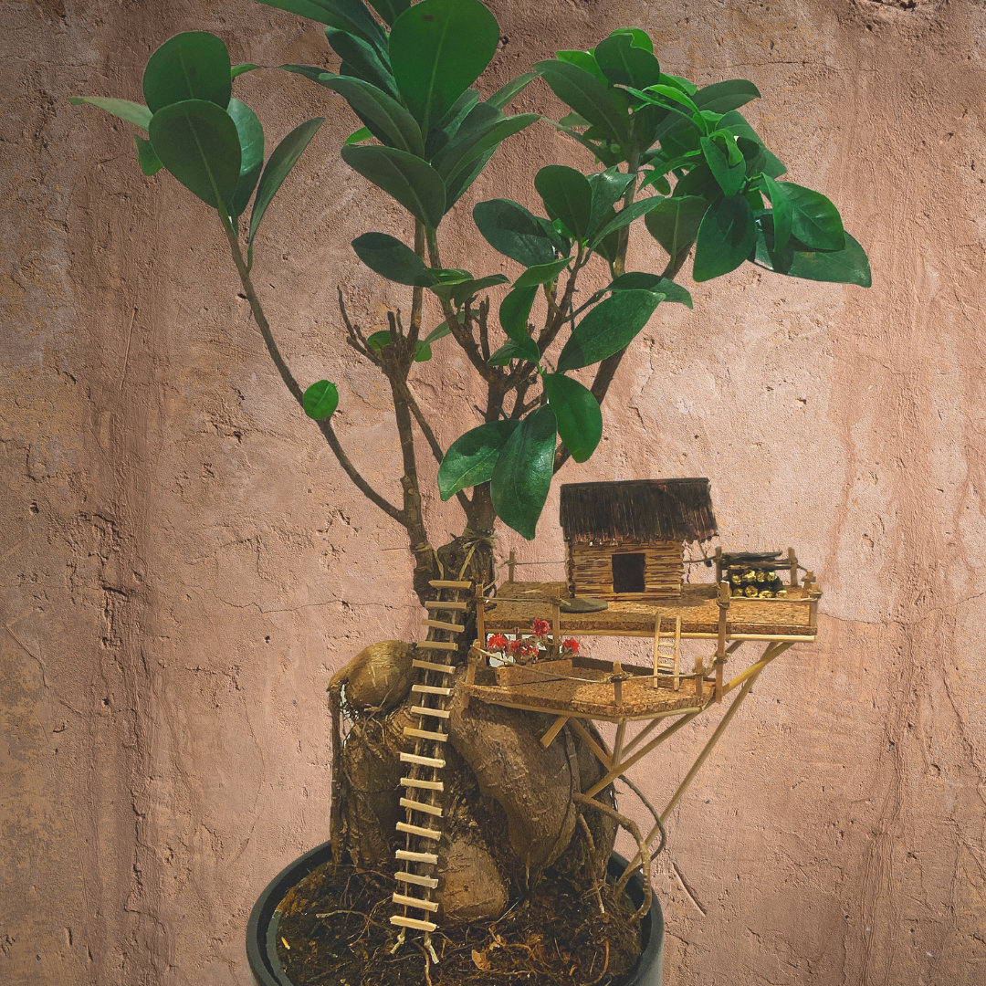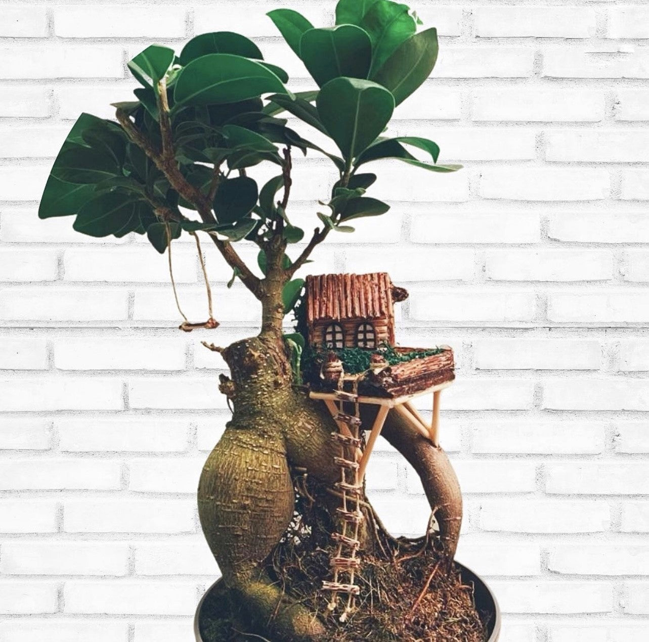 La casita que todos quisimos tener en un árbol cuando éramos pequeños, pero en versión mini y más pro, colocadas en pequeños ficus y otras plantas.