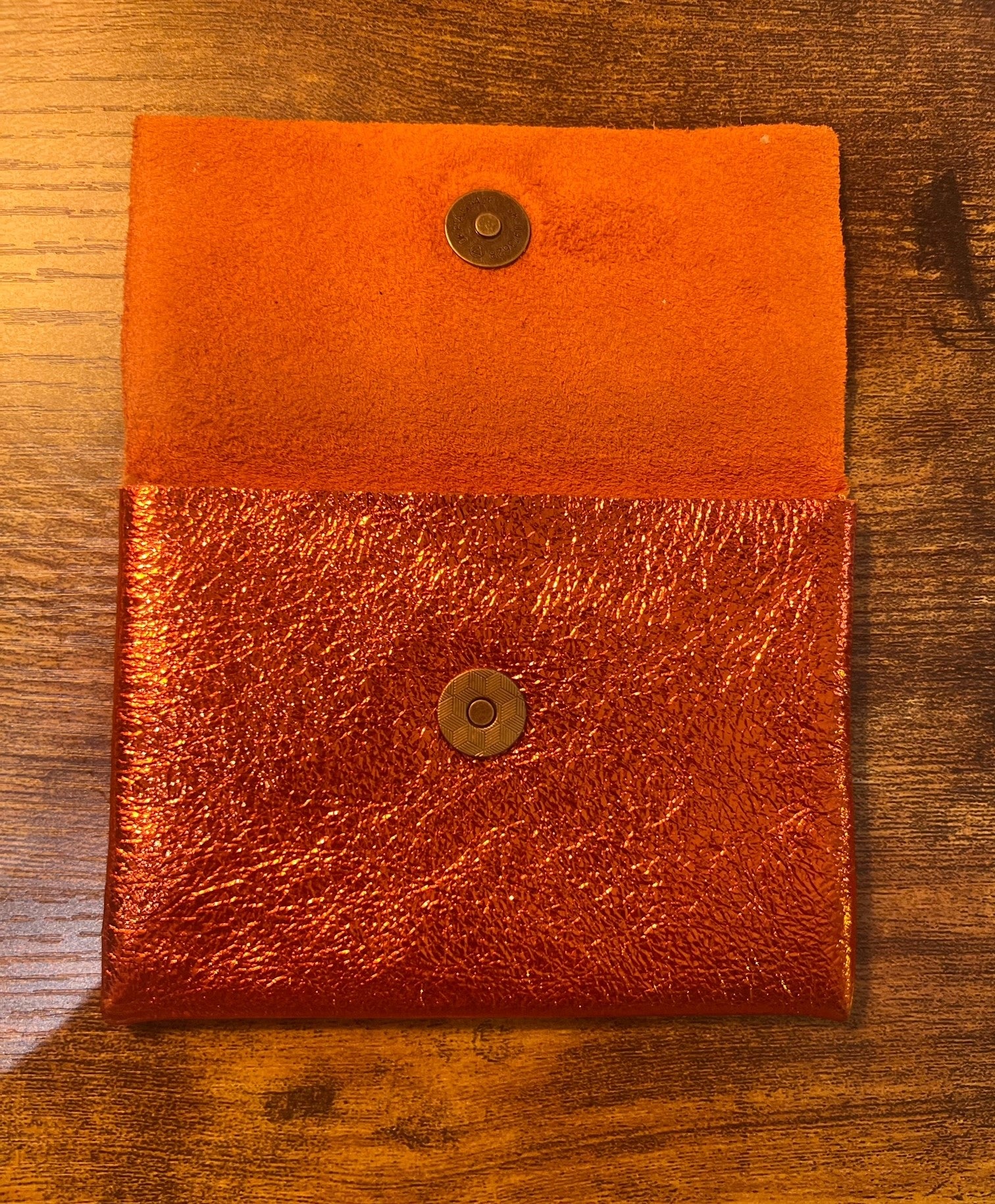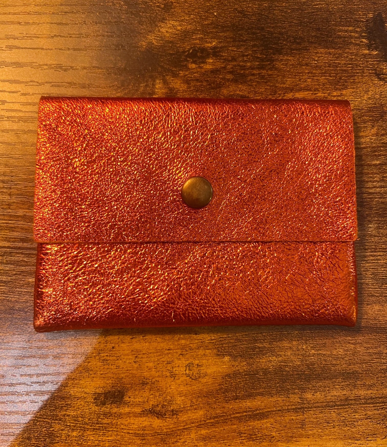 Tarjetero de cuero auténtico metalizado de color naranja
